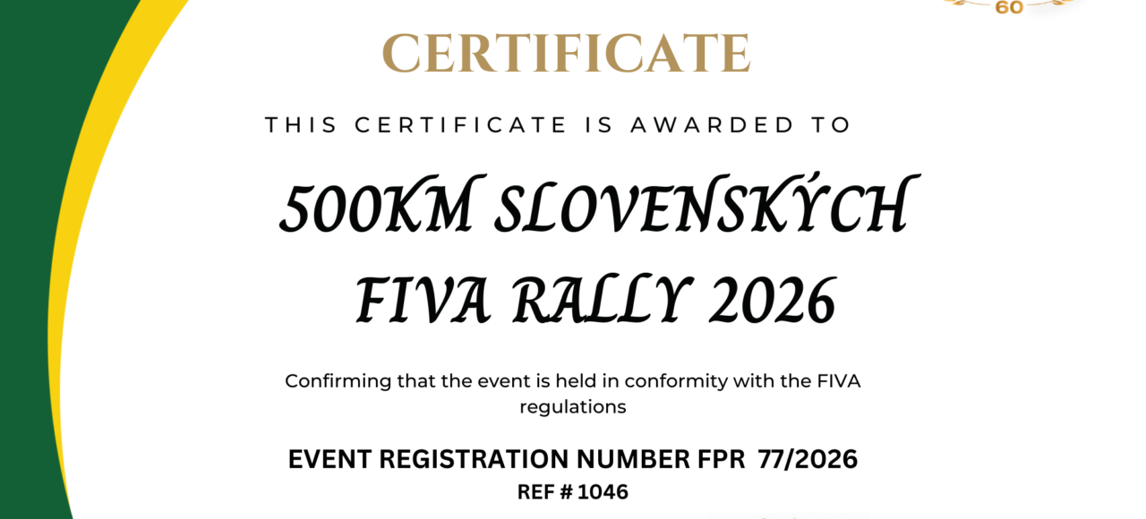 S hrdosťou oznamujeme, že podujatie 500km SLOVENSKÝCH FIVA RALLY 2026 získalo prestížny certifikát „Premier Event“ od organizácie FIVA. Toto ocenenie potvrdzuje, že naše podujatie spĺňa medzinárodné štandardy a pravidlá pre historické vozidlá a patrí medzi uznávané podujatia v rámci kalendára FIVA. Ďakujeme všetkým partnerom, organizátorom,...