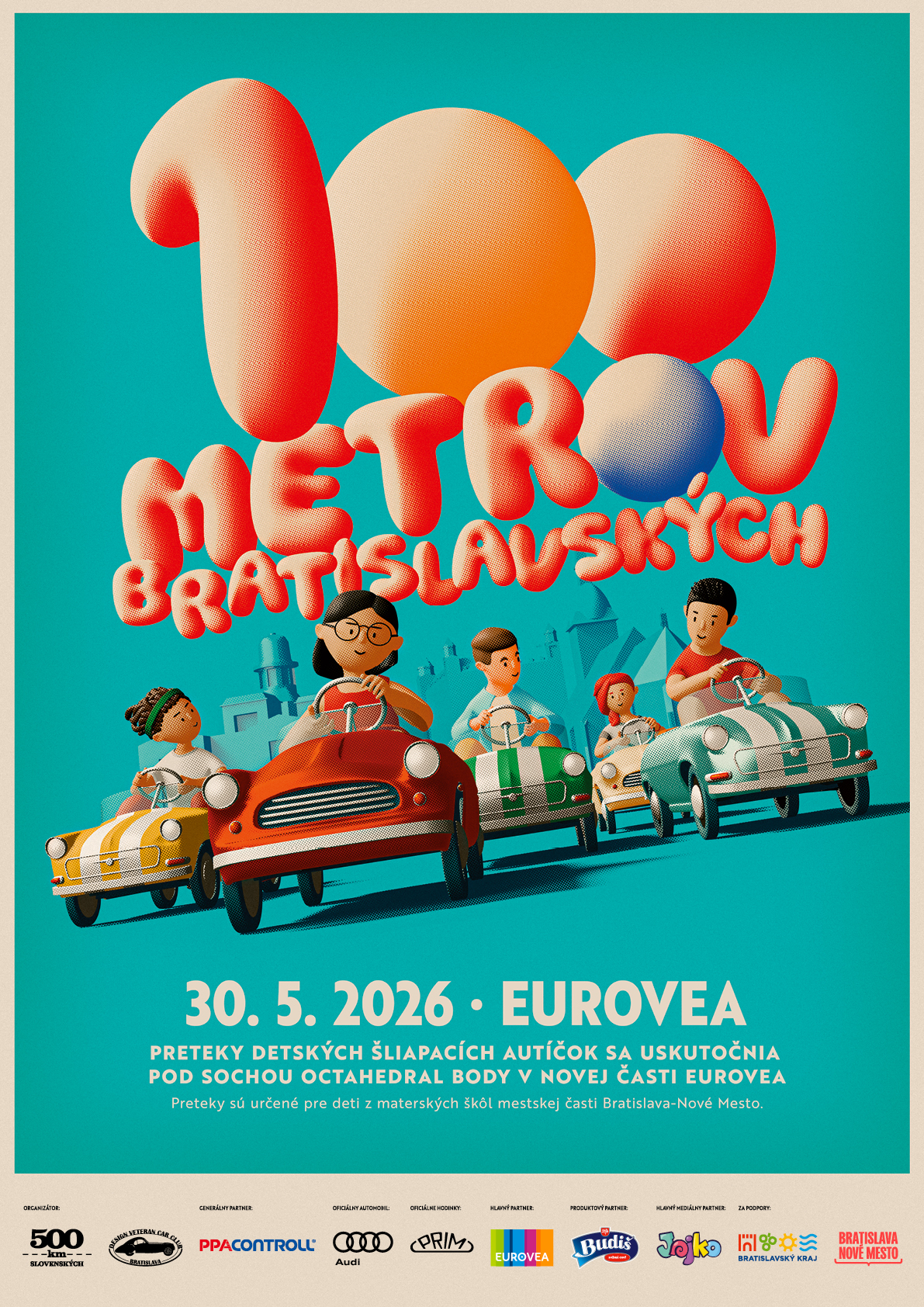 Netradičné, originálne a milé. Všetky tieto prívlastky by sme mohli pripísať podujatiu s názvom 100 metrov bratislavských. Preteky sa uskutočnia v sobotu 30. 5. 2026 v Bratislave. Malých súťažiacich povzbudia rodičia ako aj návštevníci. Ide o preteky škôlkarov, ktorí sa musia do cieľa dostať čo najrýchlejšie, a to pomocou behu v šliapacích autíčkach limitovaných edícií. Podujatie 100 metrov bratislavských je súčasťou pretekov veteránov 500km SLOVENSKÝCH.
